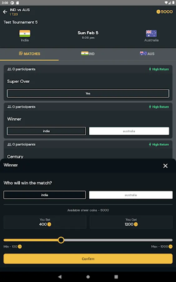 Experience a prediction based sports betting world game. Invite friends, create groups, bet amongst your group and get scorecards for every match and tournament. Place bets using sheercoins and earn rewards in sheercoins. Easy to use UI and quick to place bets. Play for fun and predict the game in advance.