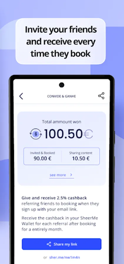 Create your community and earn money in your wallet! Receive €5 for each friend you invite, plus 2% of their total booking amount.