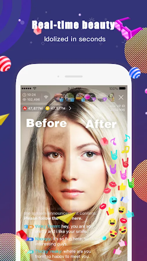 - Real-time beauty, high-quality live video, you will broadcast with confidence and become an idol in seconds