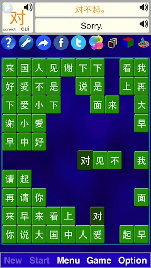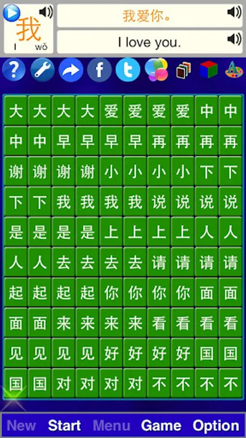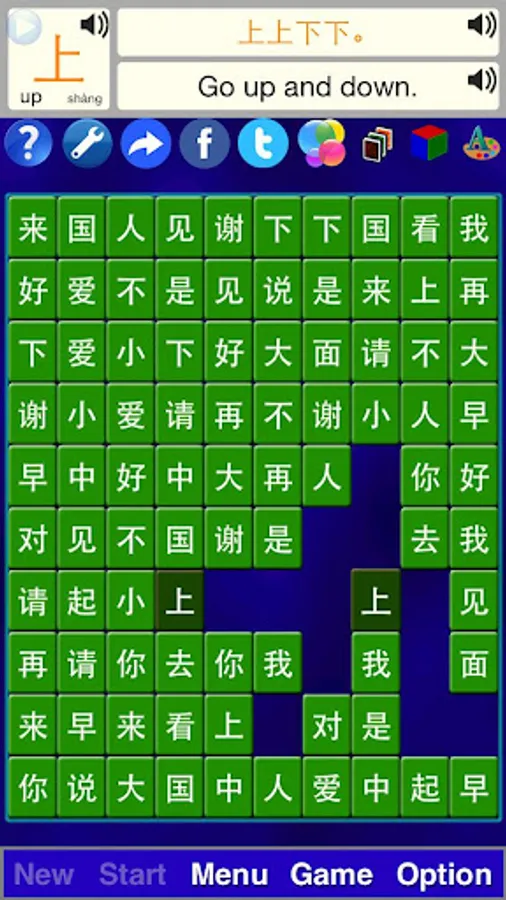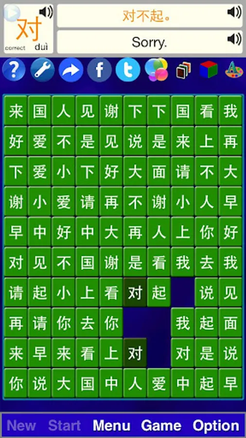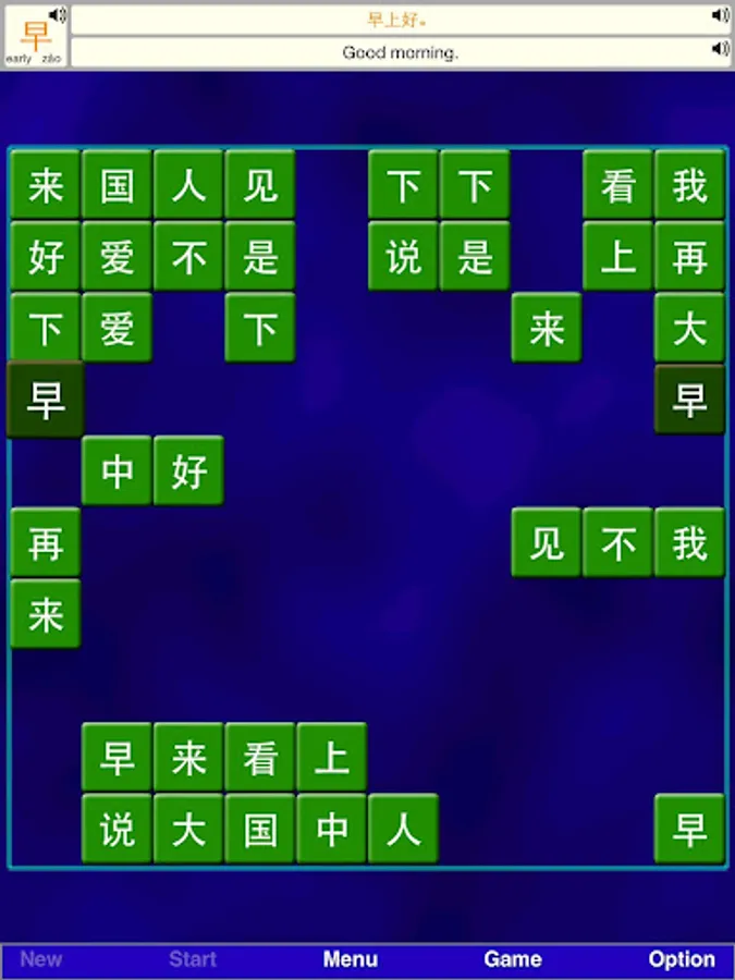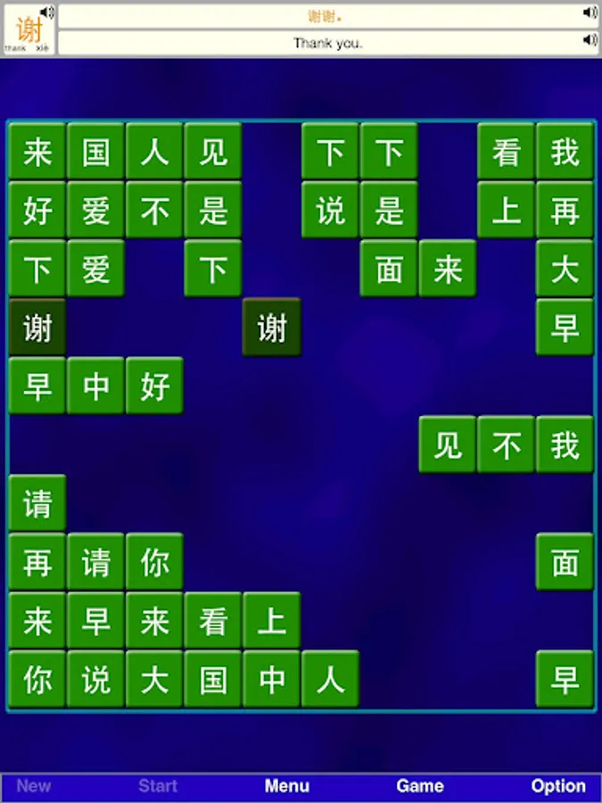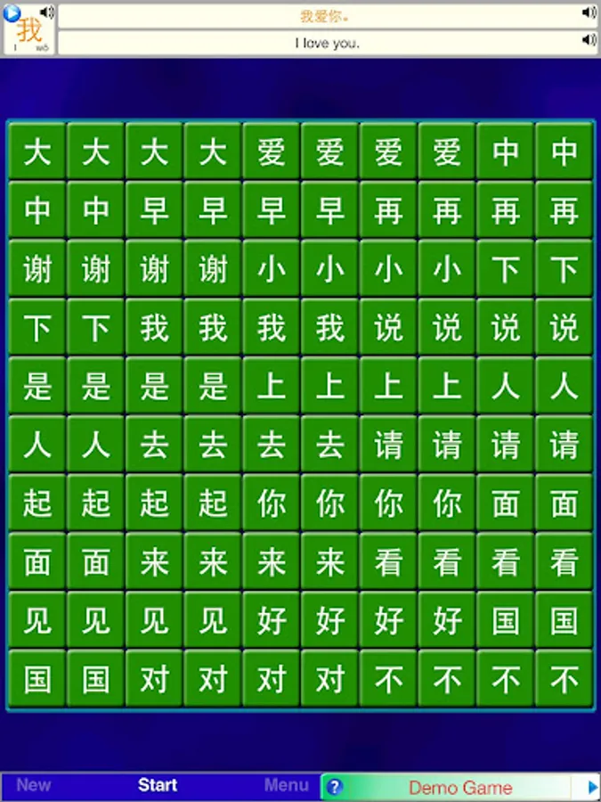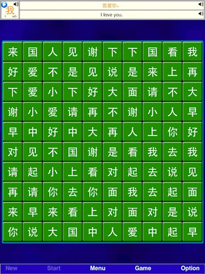 Learn 25 most frequently used Chinese characters during playing the game. Turn on sound option to listen to pronunciation of 25 characters and 25 basic greeting sentences. It's full of fun and education.