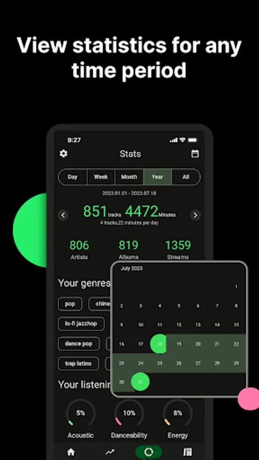 You can know your listening counts, duration, audio features, genres, and other data on different periods such as day, week, month, etc. Therefore, you can look at data over time to see how your preferences have changed. If you upload a Spotify data file, you can view more lifetime listening data.