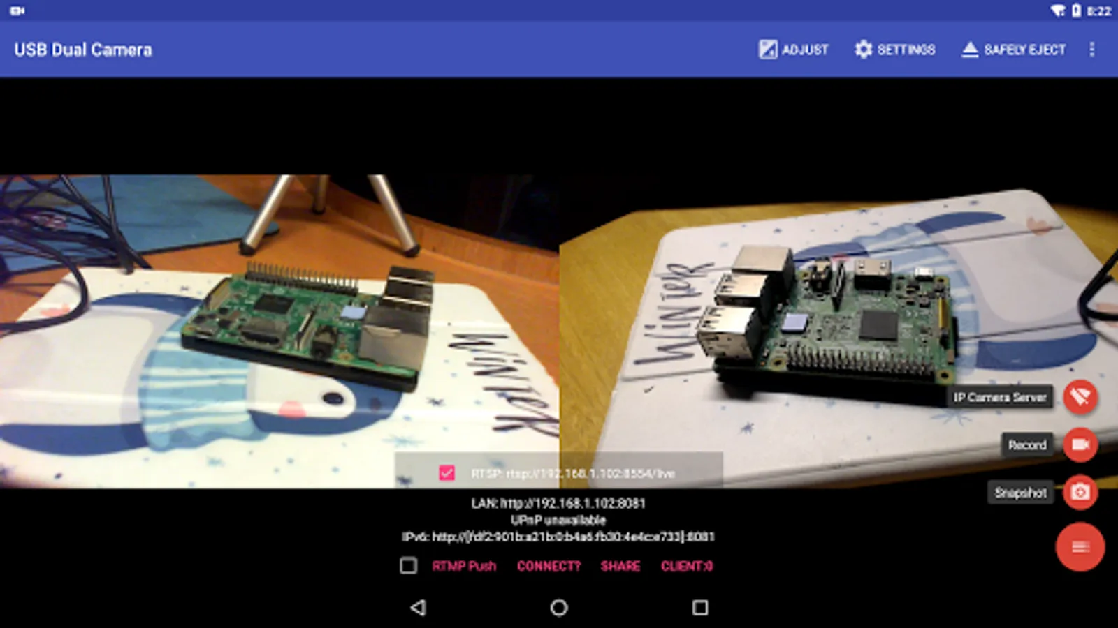 "USB Dual Camera" can let your android device connect to 2 USB WebCams or video capture cards via USB-OTG at the same time. You can record video or capture snapshot., OR turn your phone into a wireless IP Camera via build-in RTSP and HTTP Server for security monitoring WITH Bi-directional audio support, you can use your browser to view, of course, include "IP Camera" App.