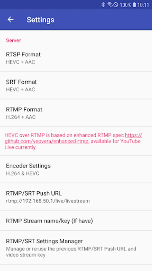 "USB Dual Camera" can push the video and audio to RTMP/SRT live media server and use for network live broadcast. It supports the rtmps security protocol and SRT protocol and it can also push the media to multiple media server at the same time. It also supports HEVC over RTMP and can be used for YouTube Live currently.