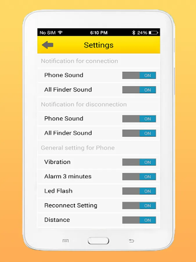 You can set to turn on/off the Phone Sound, All Finder Sound when connection is paired or broken. Also you can set Vibration, Flash when alarming. Moreover, you can set the Alarm Distance which is NEAR or FAR and select the Ringtones of the phone when alarming.