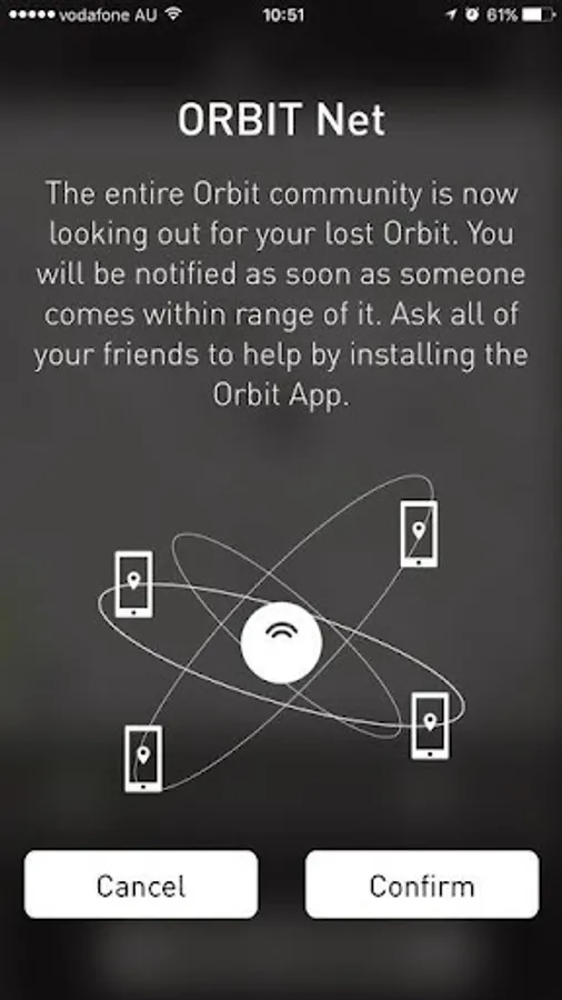 The entire Orbit community is looking for all the lost Orbit. Mark your Orbit as lost and you will be notified as soon as someone comes with range of it.
