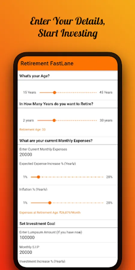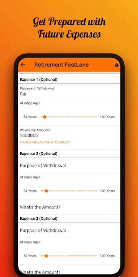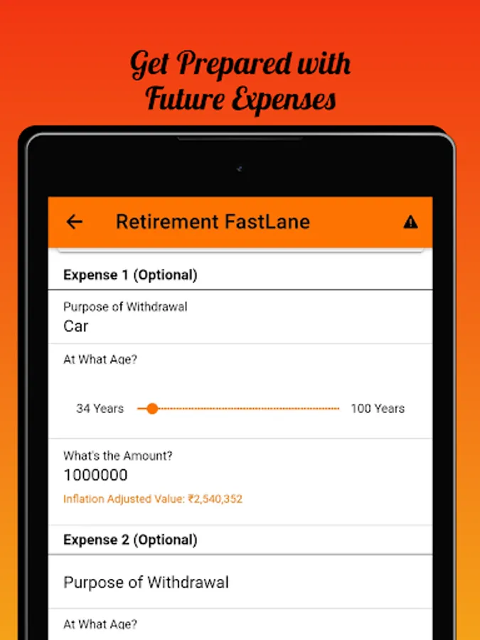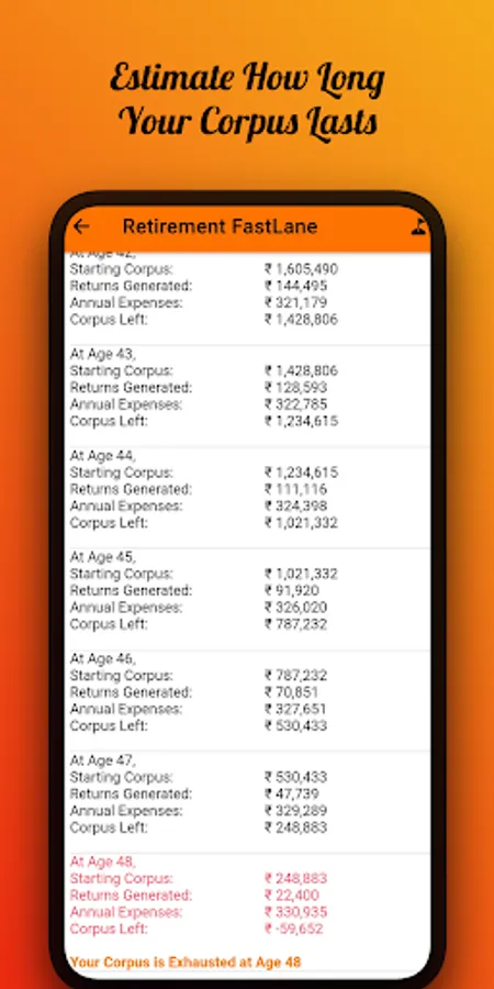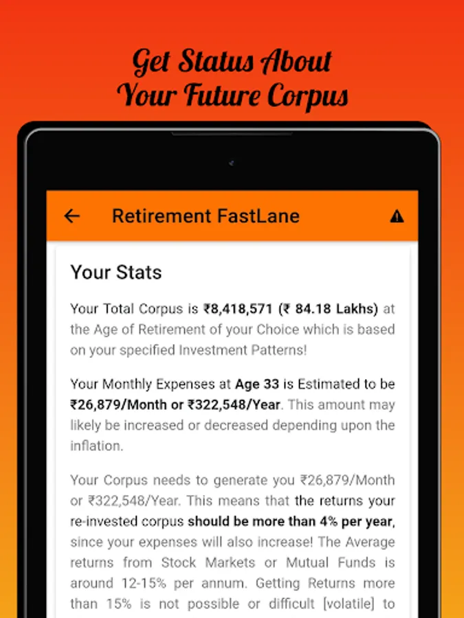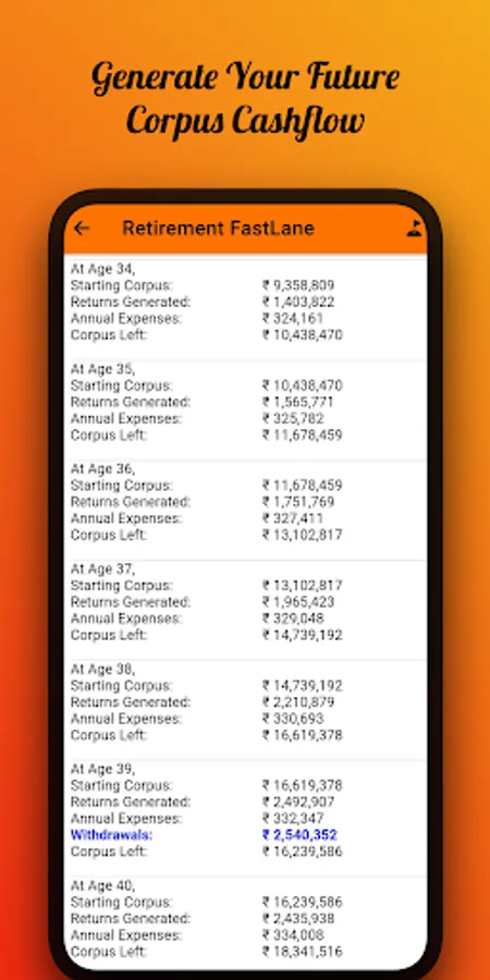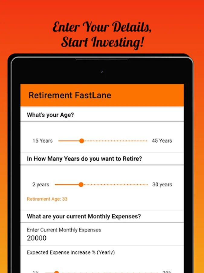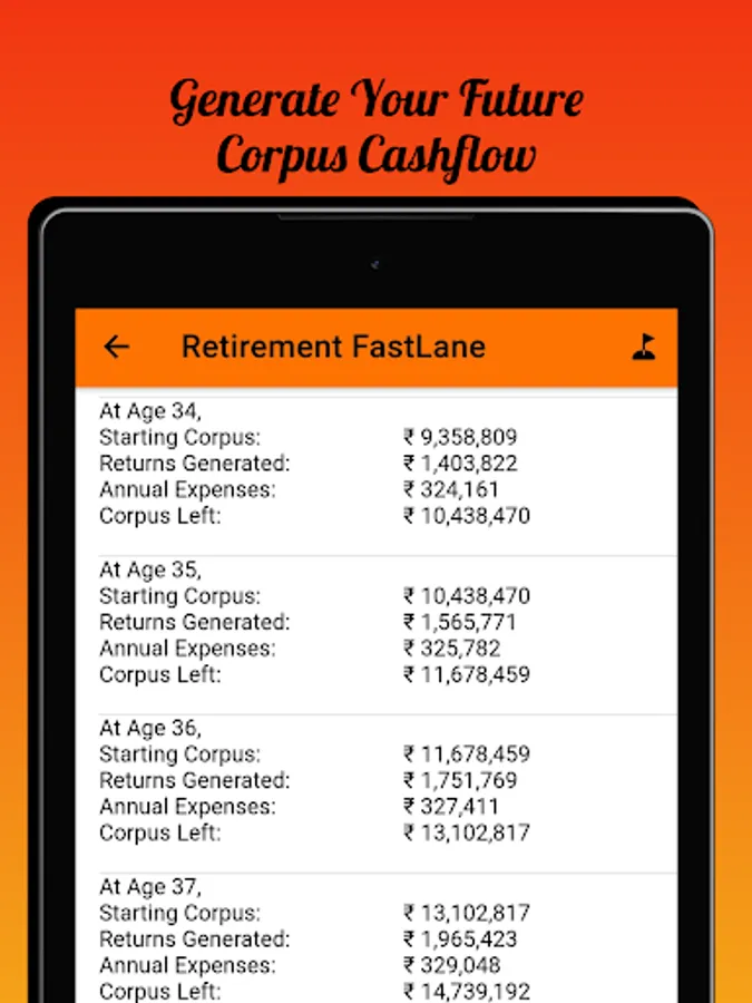By Entering your desired age to retire along with other details like current expenses, future needs, inflation etc., the app will suggest you start investing and accordingly calculate your retirement corpus. Using the returns generated by this corpus, the App will Calculate a Yearly Cashflow Pattern which will determine how long this corpus will last, in correspondence to other factors like increasing expenses, inflation and your future needs!