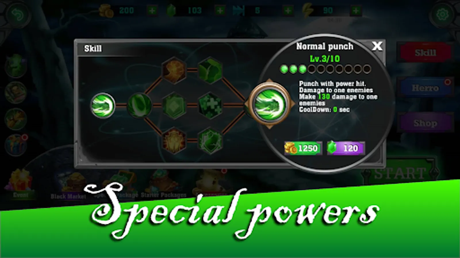 Hero super skills: dragon call, lighting power, ball blast ring, magic punch.