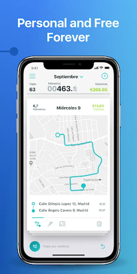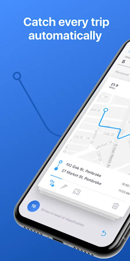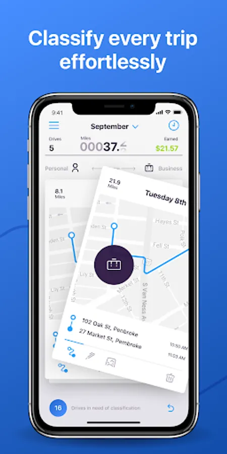 - Track drives and categorize them with a swipe—swipe right for business drives and left for personal drives