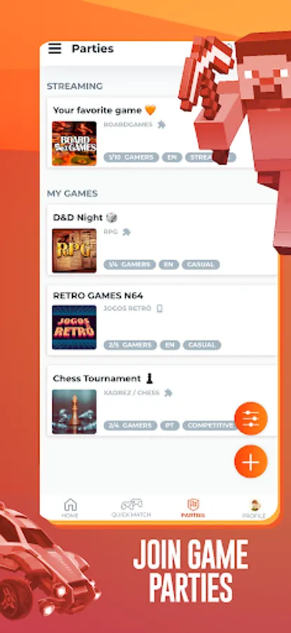 Simply sign up with your email account, create a profile, add the games you play, and use one of the matchmaking features: Quick Match, to find a another gamer to play as a dúo, or Parties, to join a squad or create your own group with your own rules.