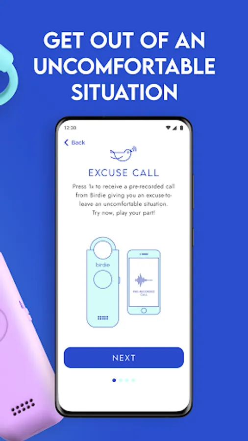 Push the button 1x to initiate a pre-recorded call giving you a tactful way out of an uncomfortable situation.