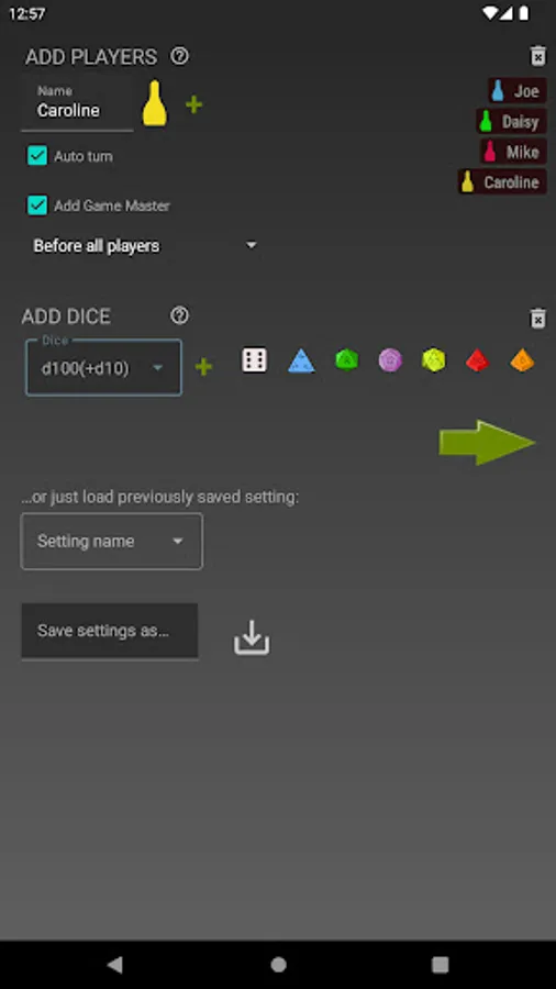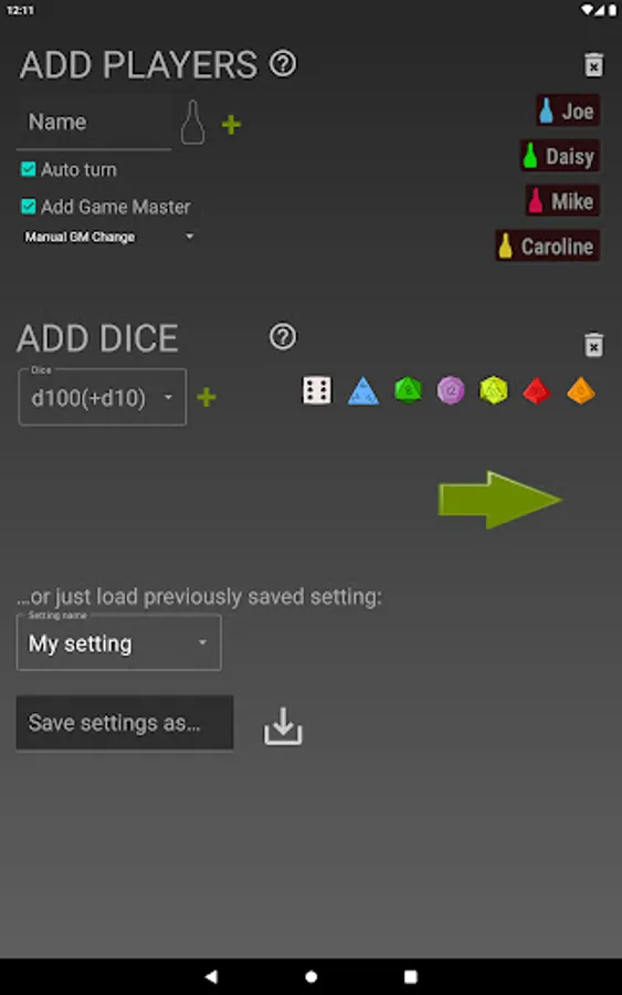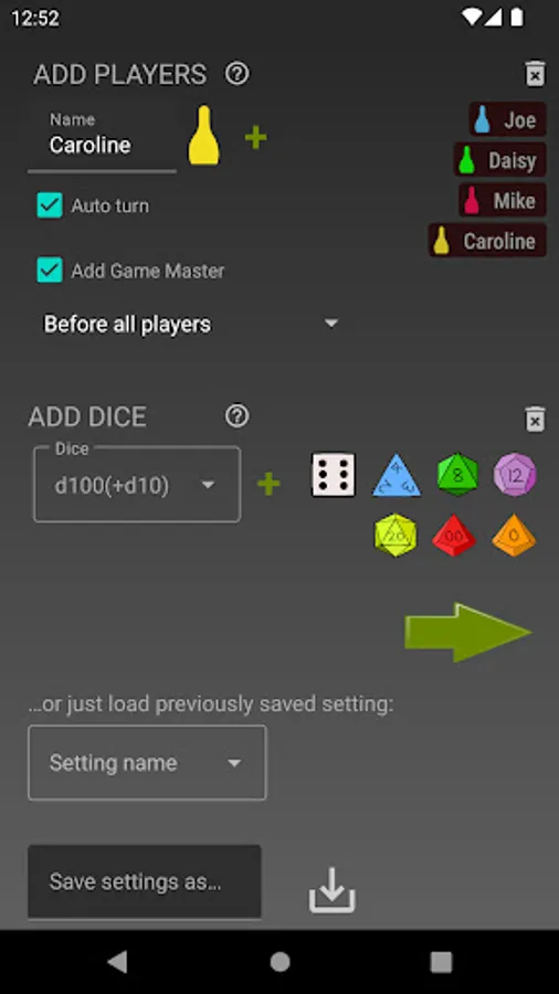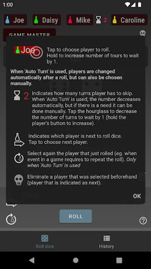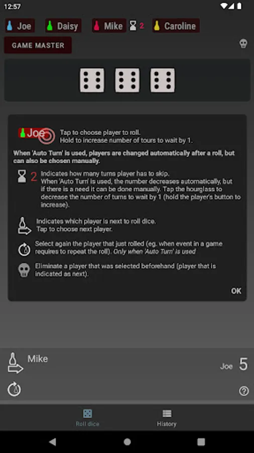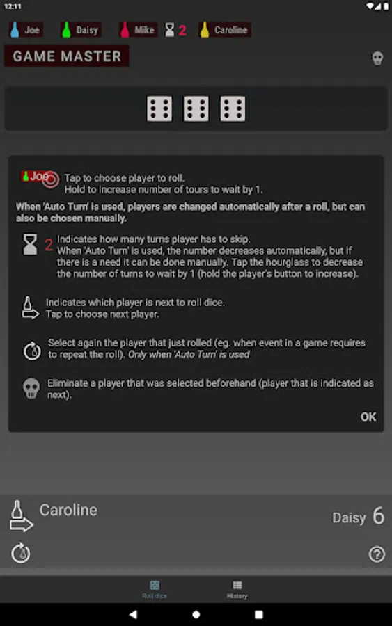 Dice Rollin' app is a support for your sessions with board or any other games that require dice to play. It is not just an app that lets you roll different types of dice. The main functionality of Dice Rollin' app is a "Game Assist" which helps a lot in controlling the course of various games, especially when there are many players and game mechanics contain a lot of turn skipping.