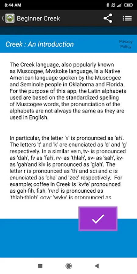 Beginner Creek is a simple and direct Creek language learning app meant as an introduction to beginners and enthusiasts.