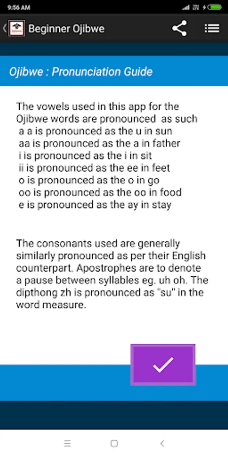 Pace yourself as you go through the almost a thousand common and popular Ojibwe words available in the app. In just a matter of weeks, you will have an essential knowledge of the Ojibwe vocabulary !