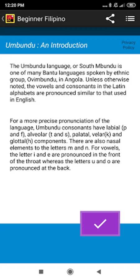 Pace yourself as you go through the more than a thousand common and popular Umbundu words available in the app. In just a matter of weeks, you will have an essential knowledge of the Umbundu vocabulary !