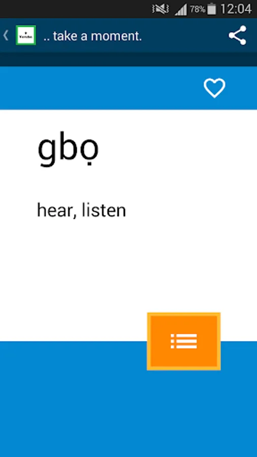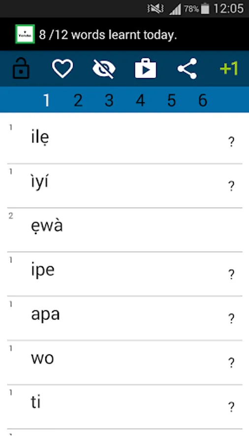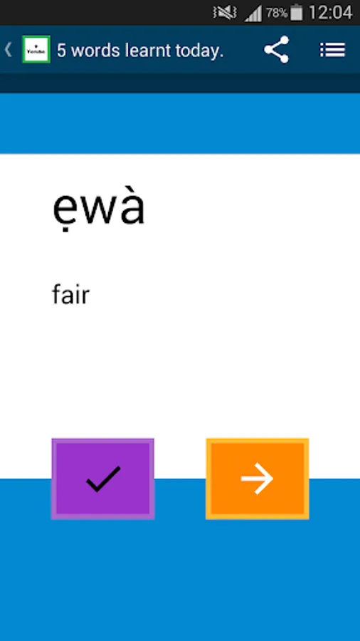 Pace yourself as you go through the almost a thousand common and popular Yoruba words available in the app. In just a matter of weeks, you will have an essential knowledge of the Yoruba vocabulary !