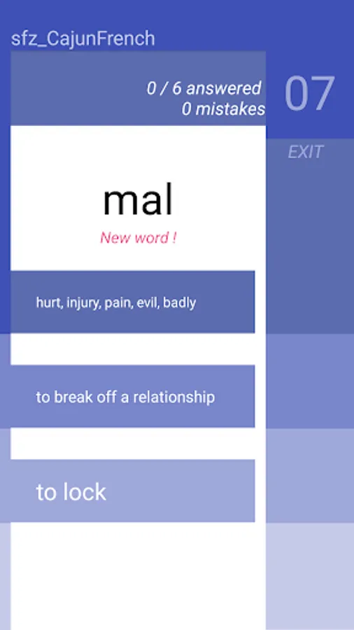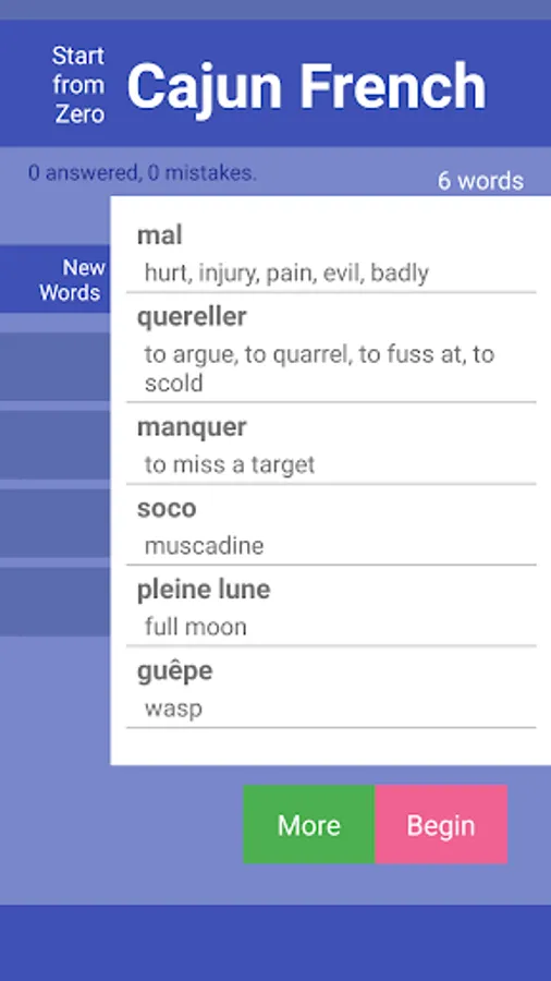 Starting from scratch, 'collect' up to 9 Cajun French words after each session and learn at your own pace. StartFromZero_Cajun French app is a really straightforward, intuitive and effective flashcard and quiz app that helps you build your Cajun French vocabulary starting today !