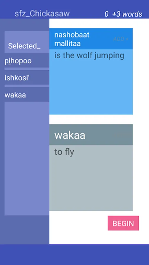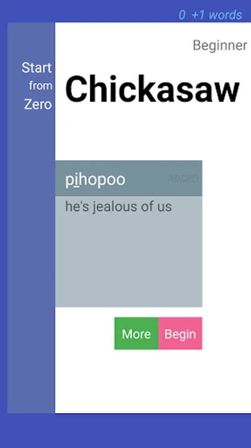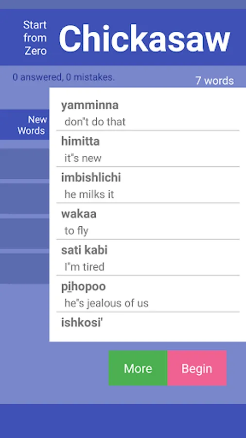 Starting from scratch, 'collect' up to 9 Chickasaw words after each session and learn at your own pace. StartFromZero_Chickasaw app is a really straightforward, intuitive and effective flashcard and quiz app that helps you build your Chickasaw vocabulary starting today !