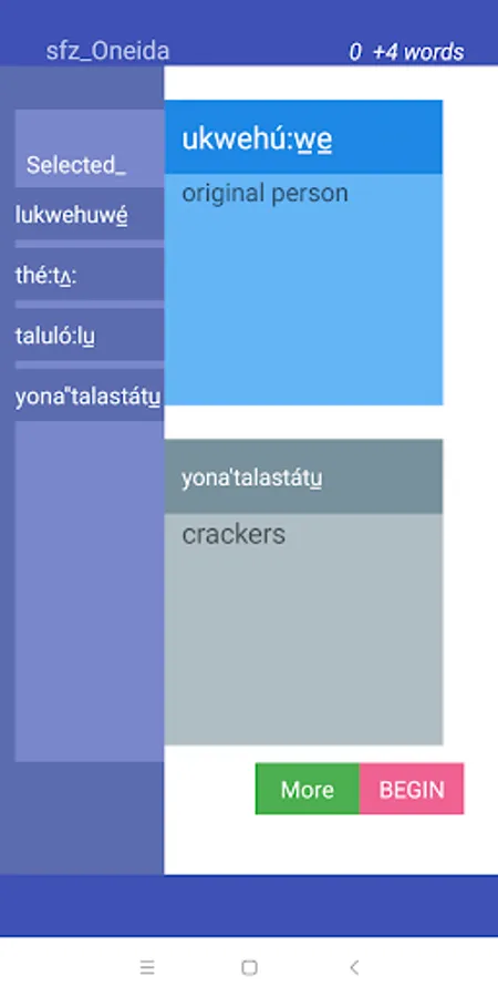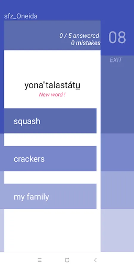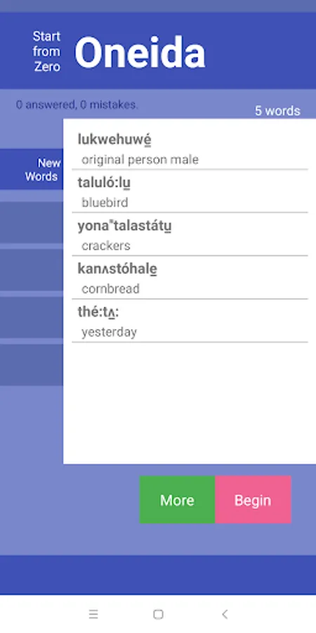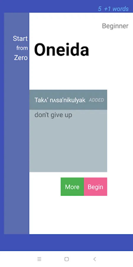 Starting from scratch, 'collect' up to 9 Oneida words after each session and learn at your own pace. StartFromZero_Oneida app is a really straightforward, intuitive and effective flashcard and quiz app that helps you build your Oneida vocabulary starting today !