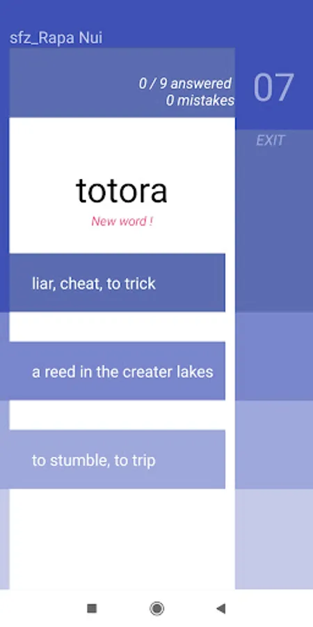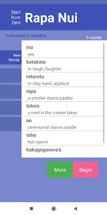 Starting from scratch, 'collect' up to 9 Rapa Nui words after each session and learn at your own pace. StartFromZero_Rapa Nui app is a really straightforward, intuitive and effective flashcard and quiz app that helps you build your Rapa Nui vocabulary starting today !
