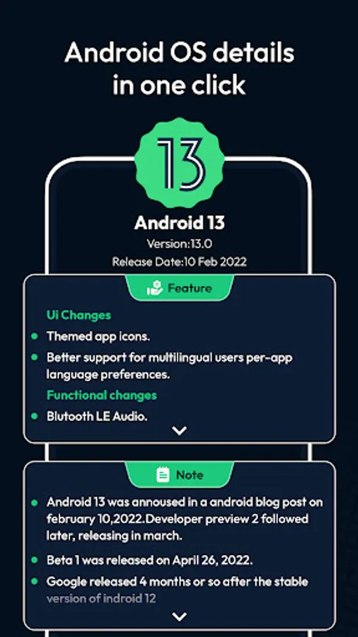 -With this app, get insight and knowledge of old and latest android versions. Get complete info on android versions :
