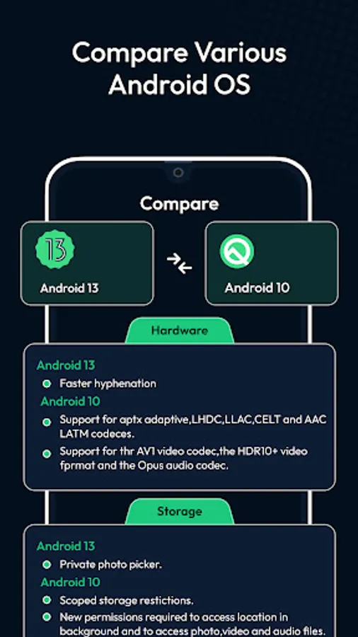 -This app will get you all details about the Latest android versions & even you can check if software updates available on your phone. You can compare different android versions for better performance.