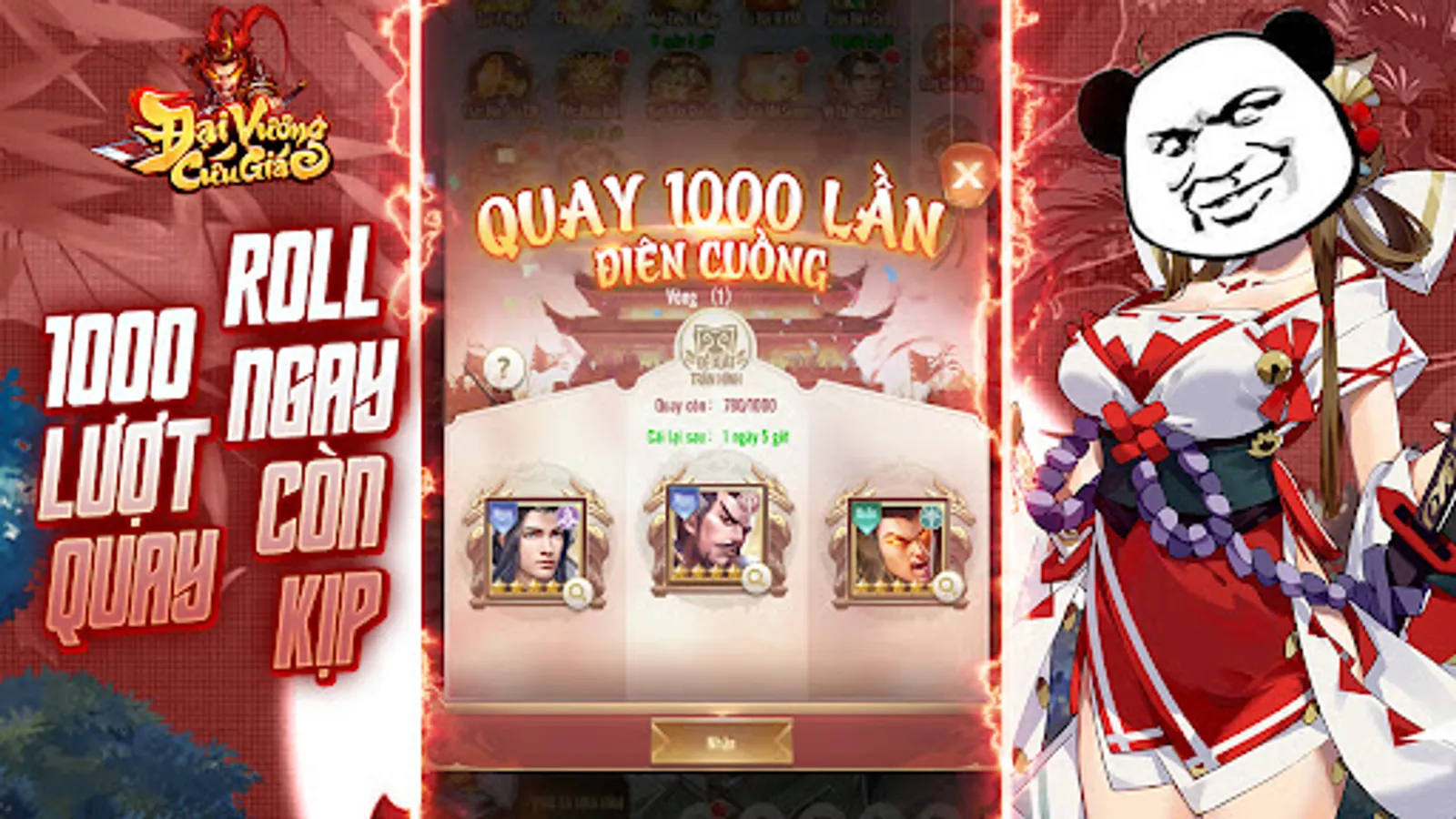Sau 10 phút nhận ngay 1000 lượt quay, có thể tùy chọn nhận hoặc thử lại, đến khi ra tướng ưng thì nhận. Thích đúng quay trúng, bổ sung miếng ghép hoàn hảo của đội hình.