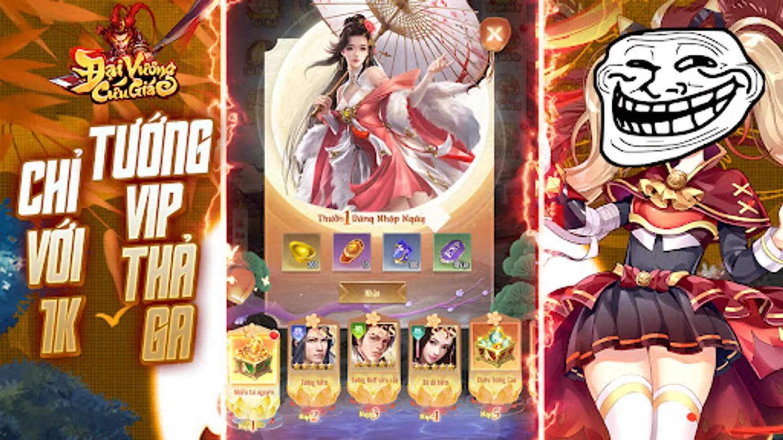 Đầu tư 10.000 VNĐ nhận quà gấp 40 lần. Thưởng 7 ngày liêp tiếp, đột phá sức mạnh, nhanh hơn người khác 1 bước: Bàng Thống SSS, Lệnh Chiêu Mộ, Đá Cường Hóa, KNB, Rương Tướng… 1 vốn 40 lời, mua cả giang sơn.