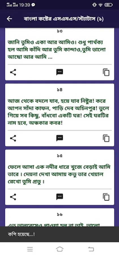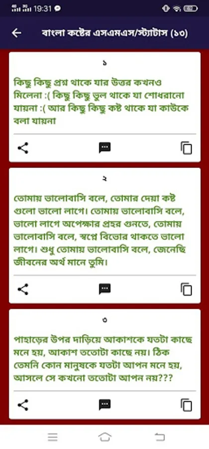 Bangla Sad Status (Sad Bengali Status) app has innumerable Sad Status in Bangla. Share your sad moments with Bangla sad status on Facebook or send a sad message to the person who hurt you. In this app, you will get many sad sms/status together. This app can be used without the internet. You can send messages / share status in Bangla very quickly, there is the advantage of copy-paste.