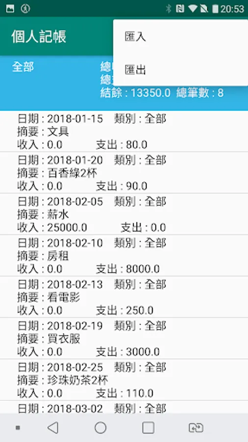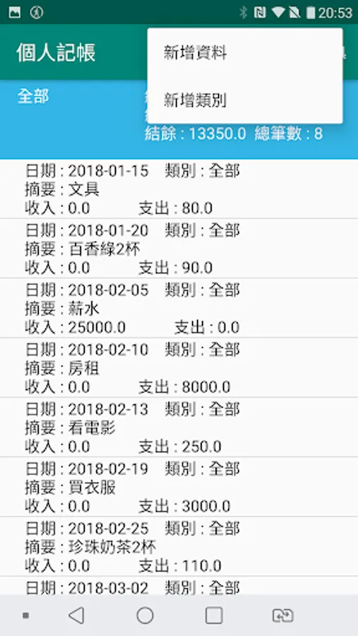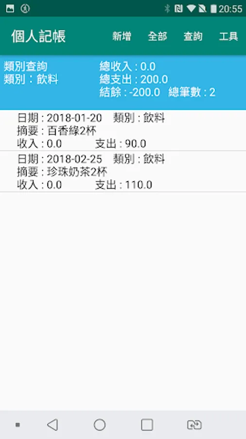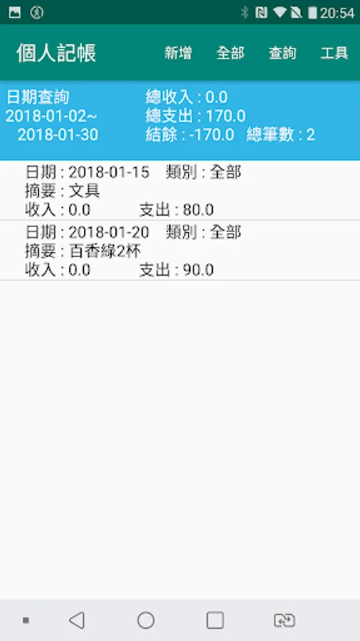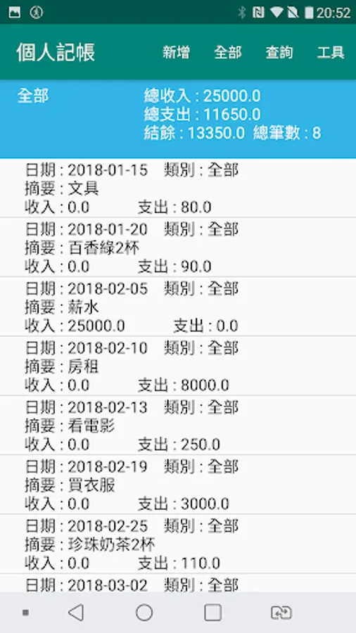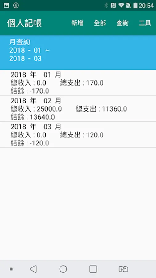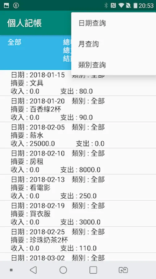 6. Query is a highlight of this APP. Date query will be listed and counted one by one according to the start and end dates. The function of monthly query is stronger. As long as you enter the start and end year and month, the monthly query will be calculated. Summarize and display item by month, category query will display the category data and make statistics. Click on the data displayed in date query and category query to enter the modification dialog box, but the data displayed in monthly query cannot be modified.