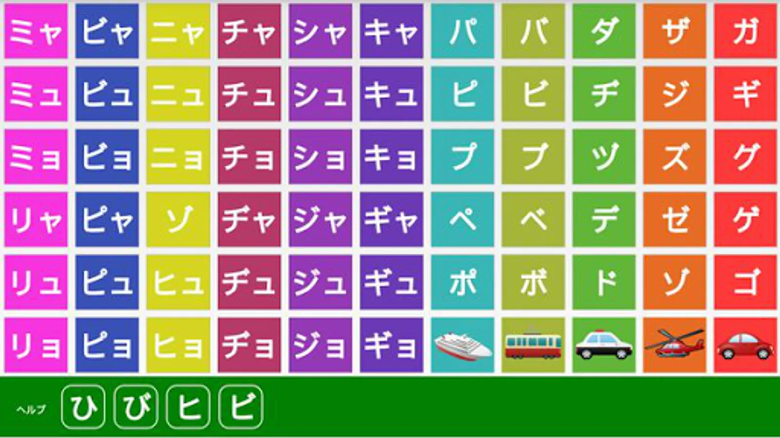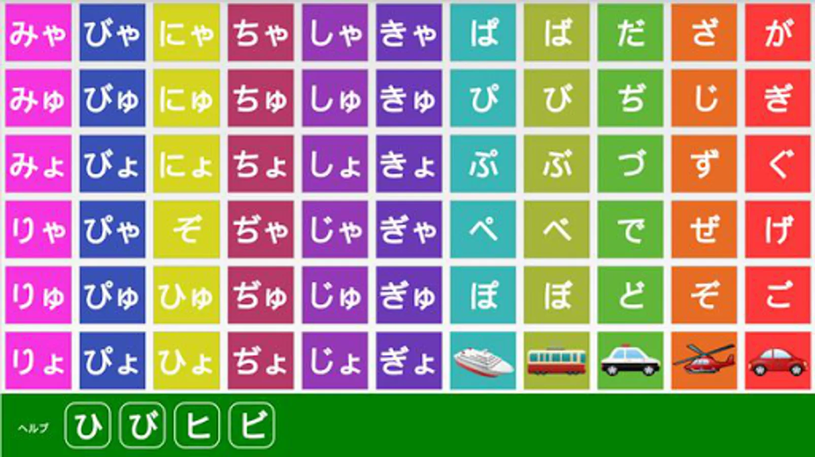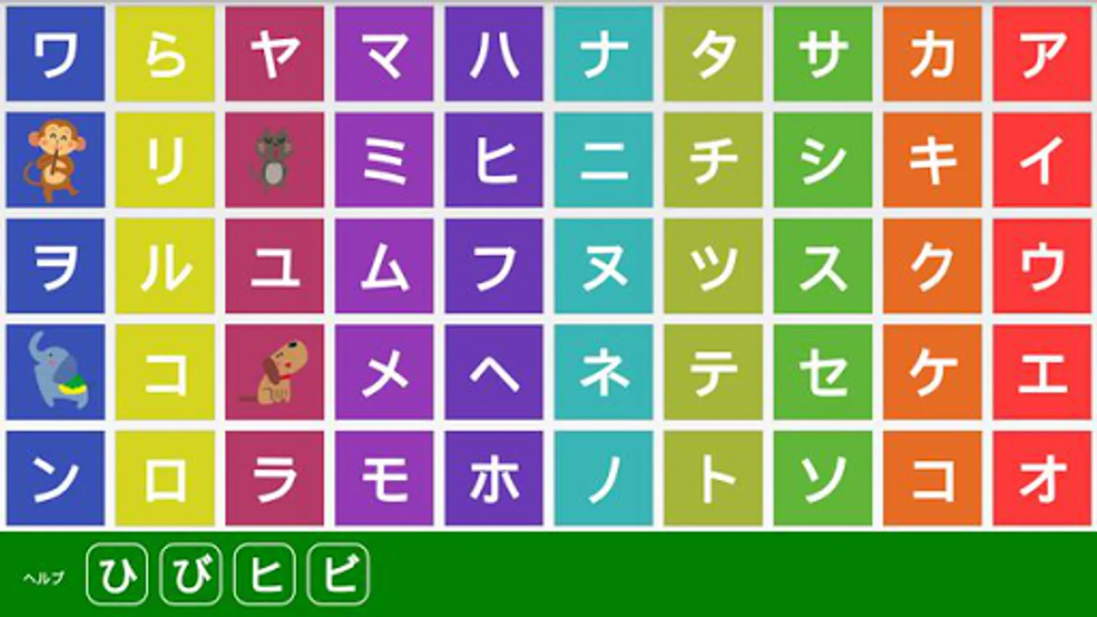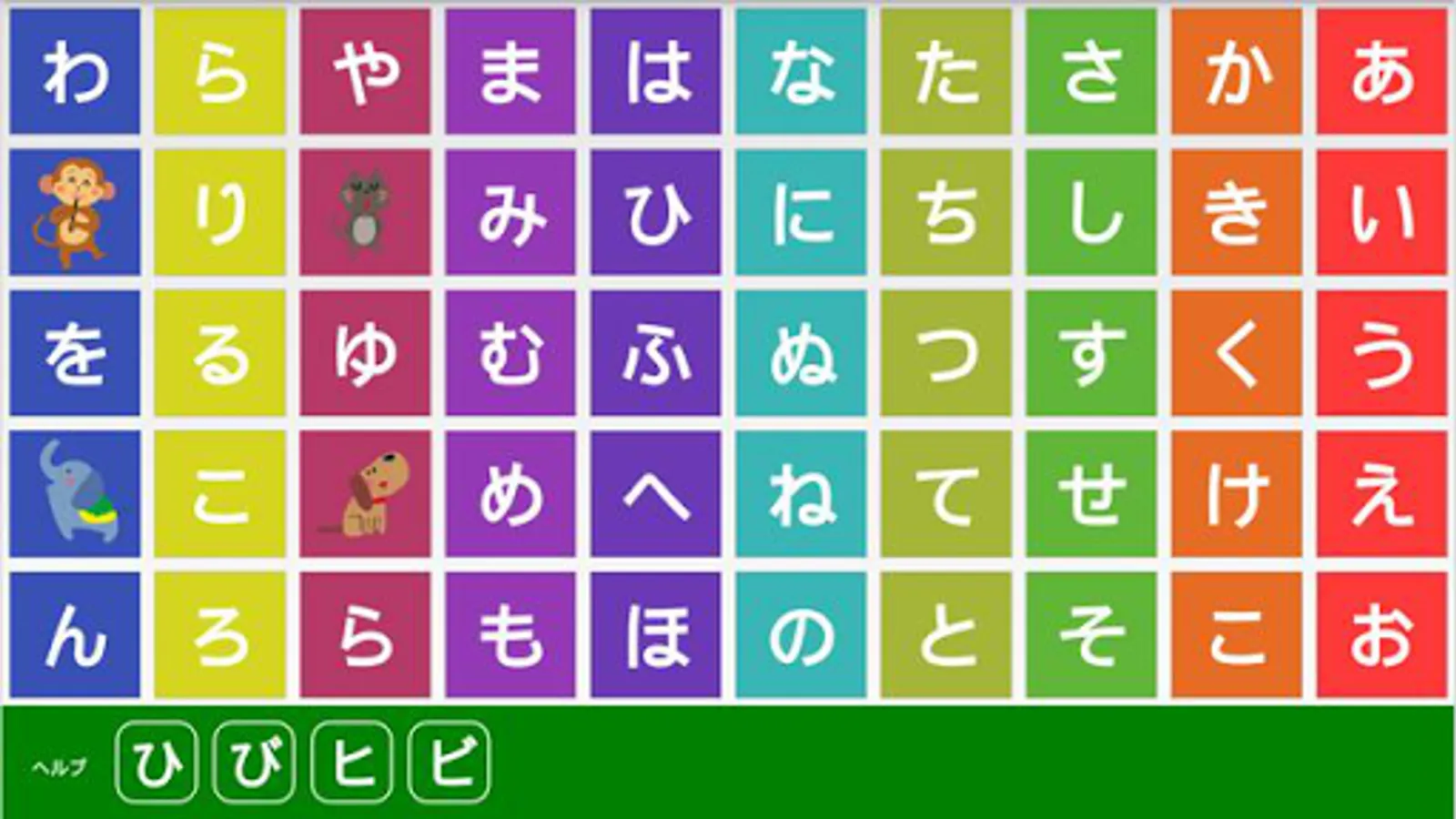 ・ひらがな表(50音、濁音、半濁音、拗音)の表示。