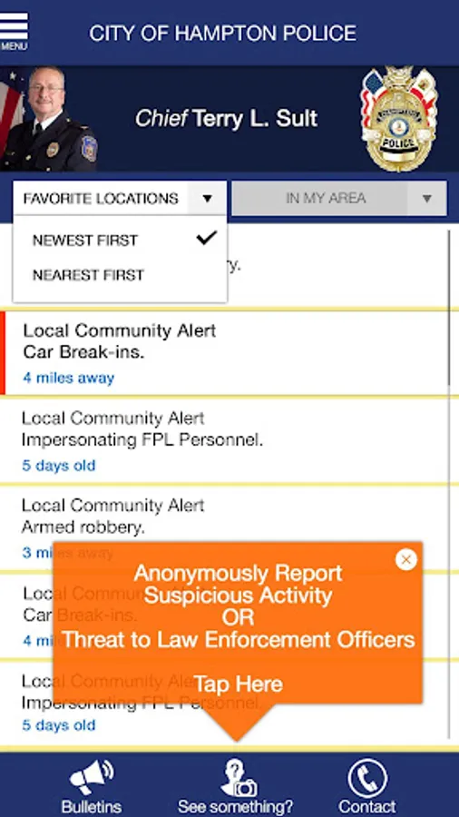 Chief Terry Sult of the Hampton City Police Department is happy to announce its new Hampton Police app for residents of the City of Hampton. Utilizing cutting-edge technologies, the app allows residents to be in immediate 2-way, GEO-targeted communication with the police right from their Apple of Android mobile device.