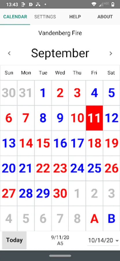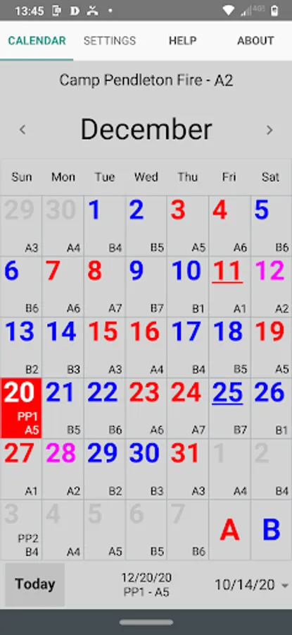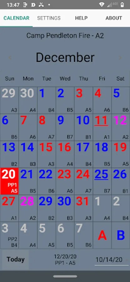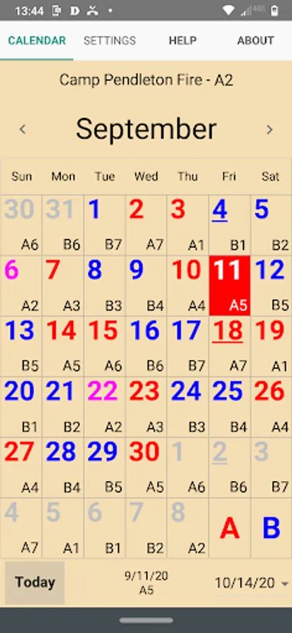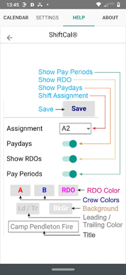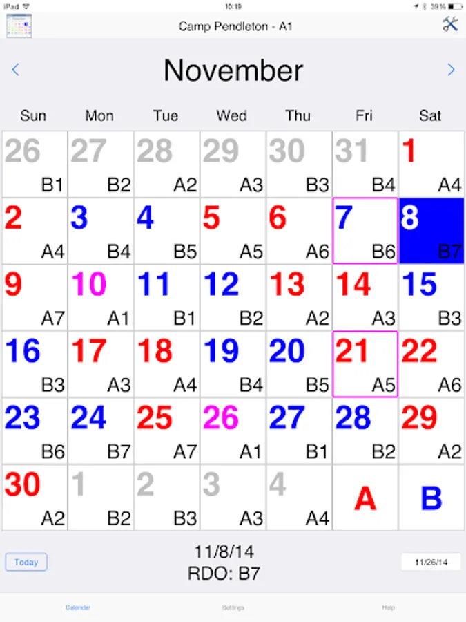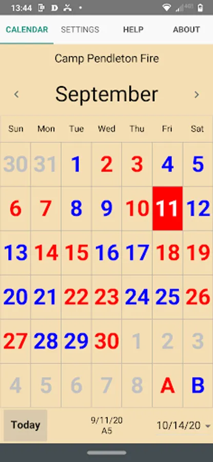 ShiftCal for Camp Pendleton Fire displays the Camp Pendleton Fire Department schedule, including RDO's and paydays.