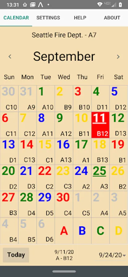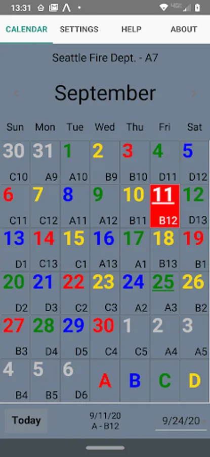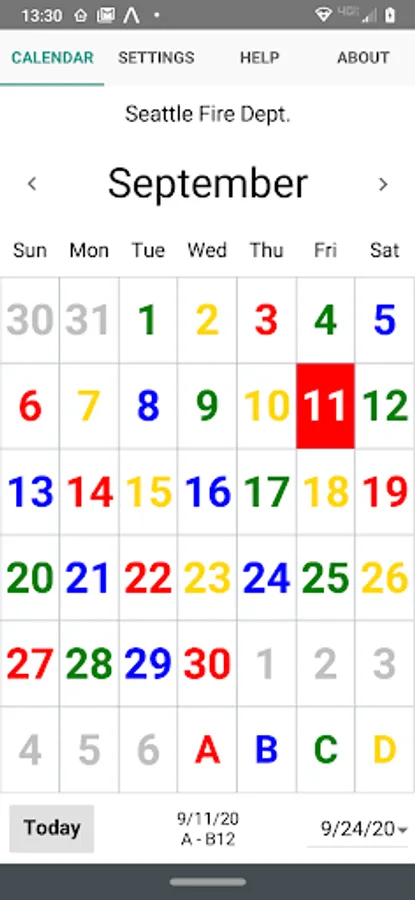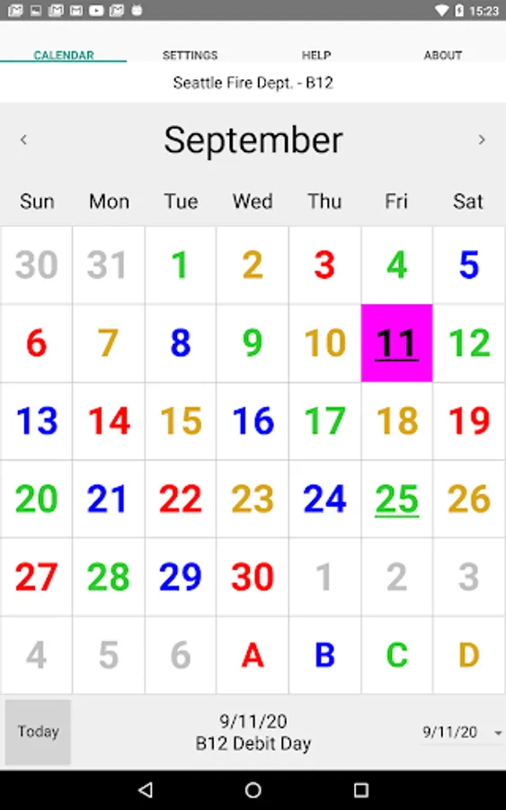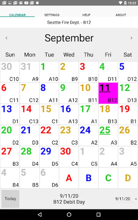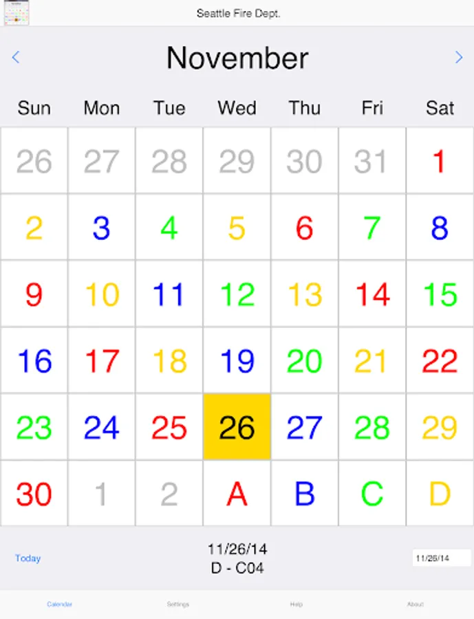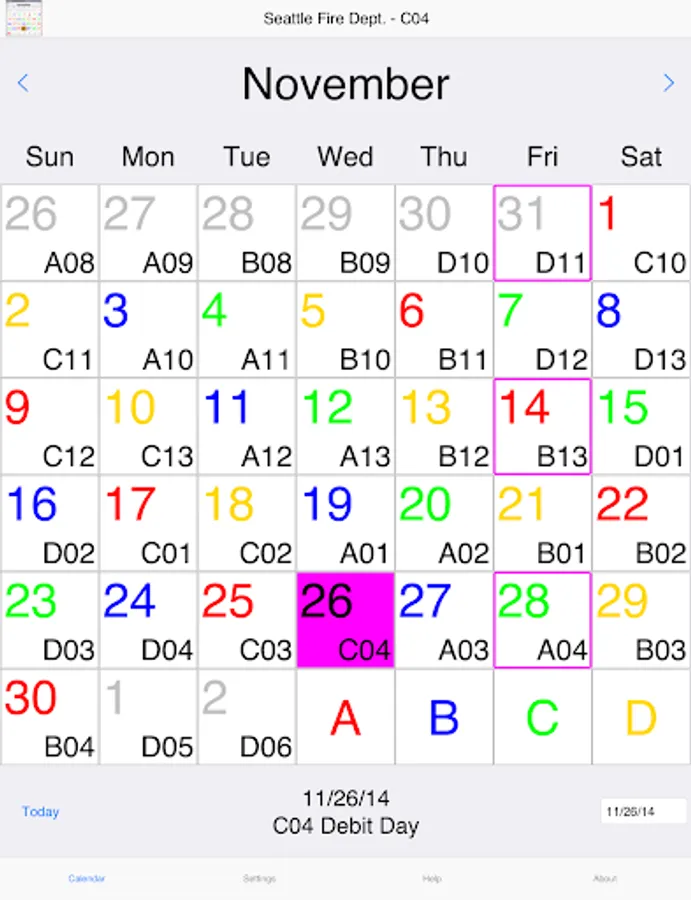 ShiftCal for Seattle Fire displays the four-platoon Seattle Fire Department schedule, including debit days and paydays.
