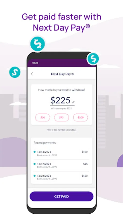 - Access our FREE Next Day Pay® service to get paid the next business day.