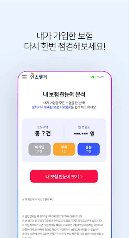 Check the subscription history of all insurance products you have subscribed to and insurance money that has not yet been claimed. You can check your insurance status by reanalyzing your insurance products by insurance company. You can reduce unnecessary insurance premiums and check excessive or insufficient coverage. We also provide customized consulting services.