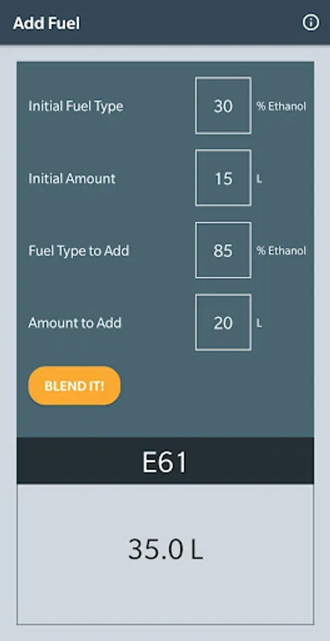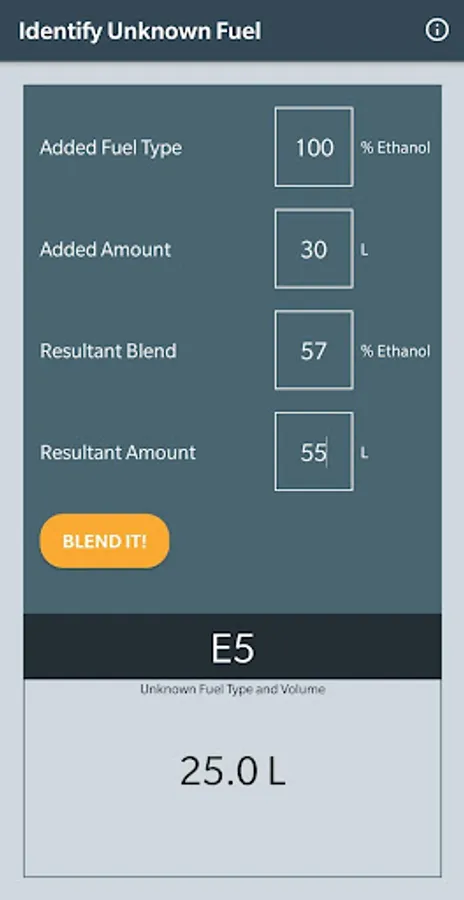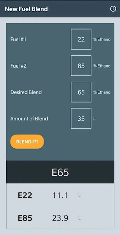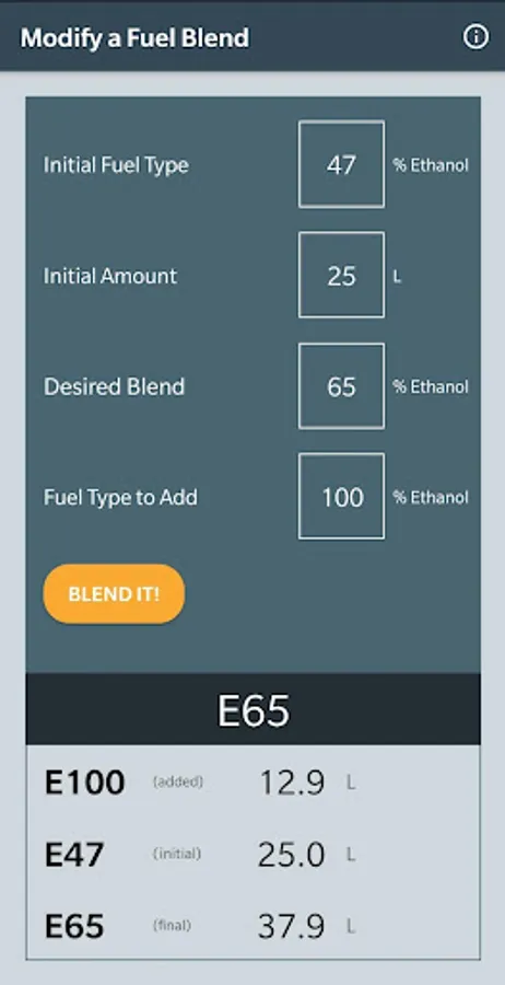This tool helps to determine the amounts of two fuel types to obtain the desired ethanol blending.