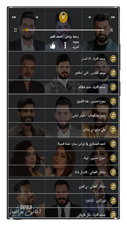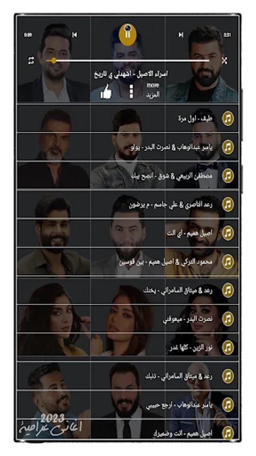 Iraqi songs 2023 without the Internet is an application that includes the most beautiful and wonderful exclusive and new Iraqi songs for the year 2022 - 2023, so that the list of songs was chosen very carefully for the most beautiful Iraqi songs for the year 2022, and the Iraqi songs are considered among the most beautiful Arabic songs most listened to and videos of Iraqi songs have millions of views. Youtube . So download the Iraqi songs 2023 application without the net and enjoy the most beautiful package of the most beautiful, exclusive and new Iraqi songs for the year 2022-2023 at all, without the Internet.
