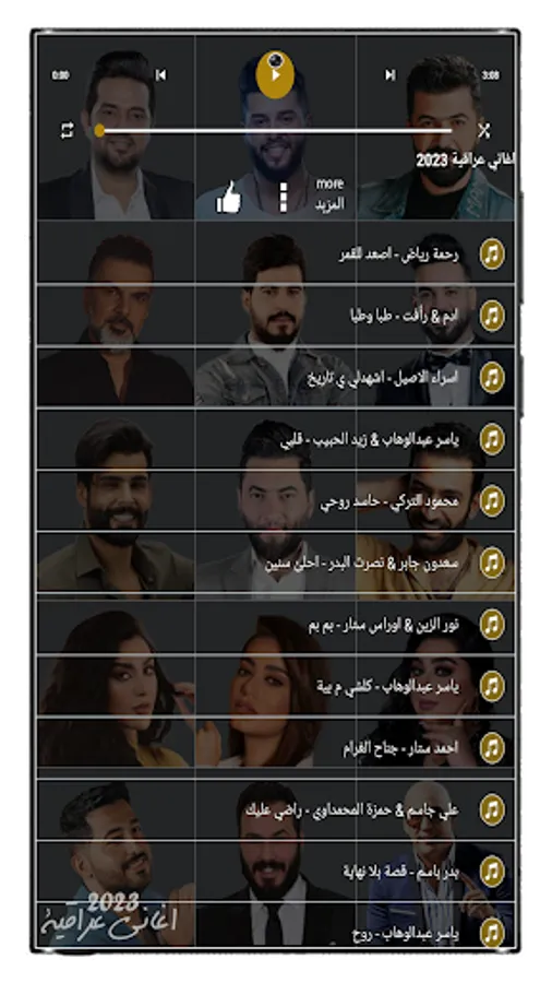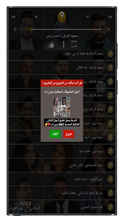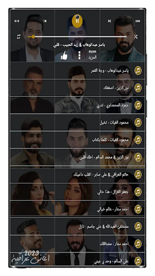 Iraqi songs 2023 without the net. It is also an application that includes many Iraqi artists, including: Muhammad Al-Salem, Jaafar Al-Ghazal, Hussam Al-Rassam, Saif Nabil, Aseel Al-Hamim, Rahma Riyad, Raad and Mithaq Al-Samrani, Walid Al-Shami, Mahmoud Al-Turki, Nusrat Al-Badr, Ali Saber, Mustafa Al-Abdullah, Nour Al-Zein, Yasser Abdel-Wahhab, Yasser Al-Bahar, Oras Star, Ahmed Al-Maslawy, and many of the famous Iraqi singers.