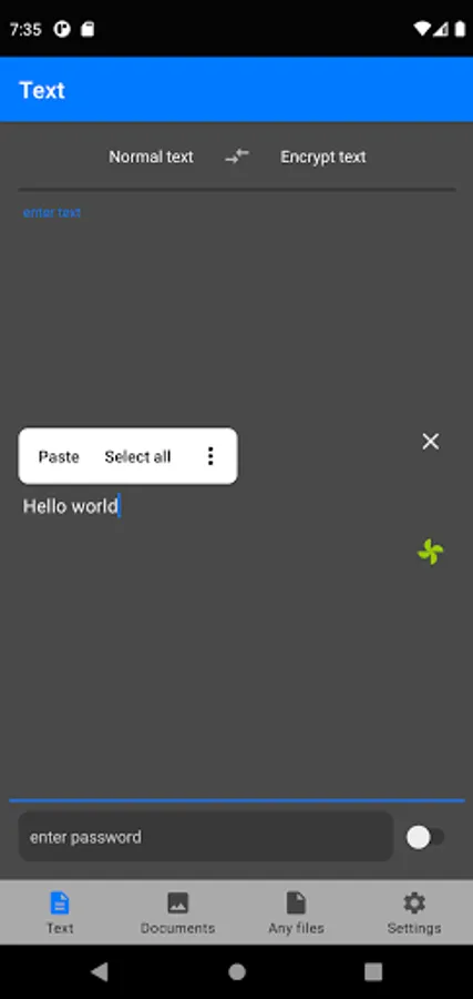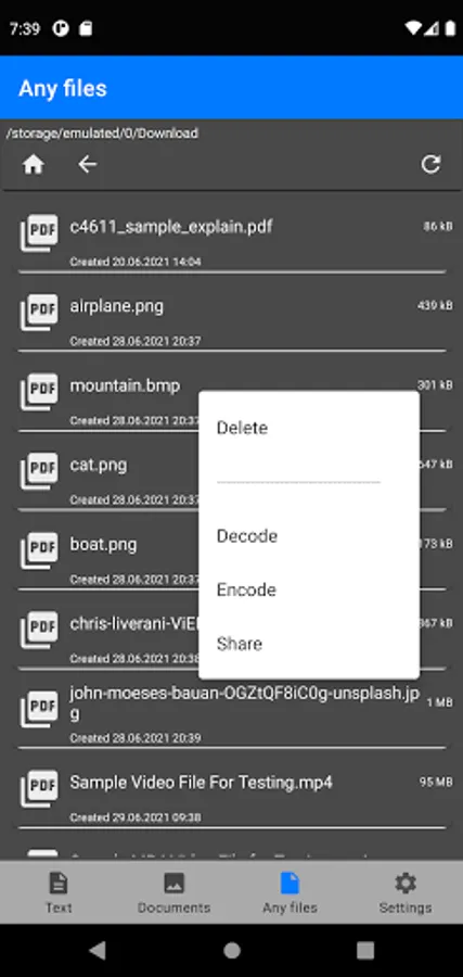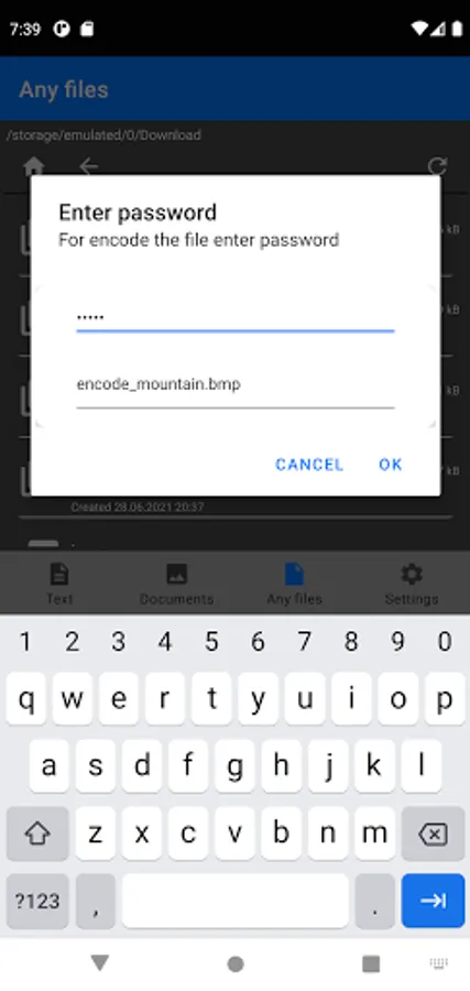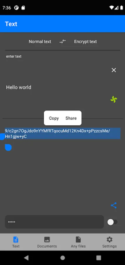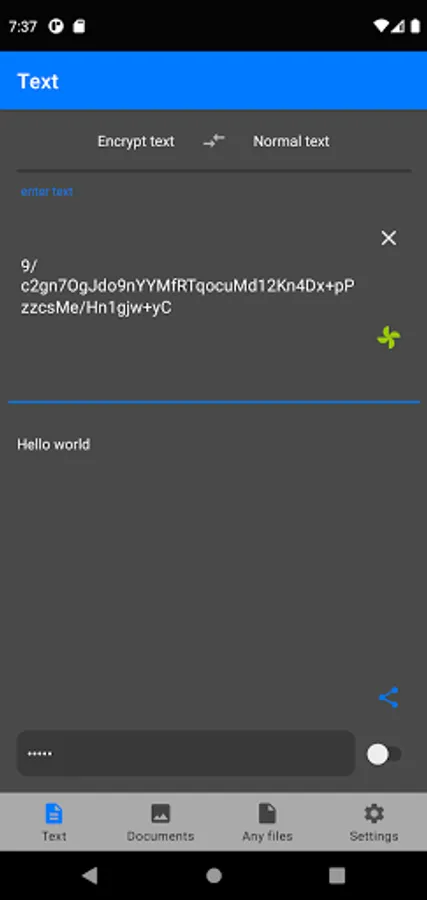 This application is designed to encrypt and decrypt text, documents such as pdf, jpg, png, as well as any files. The application also allows you to share the result of encryption and decryption processes with other applications, for example: messengers, cloud storage, file managers, email clients.