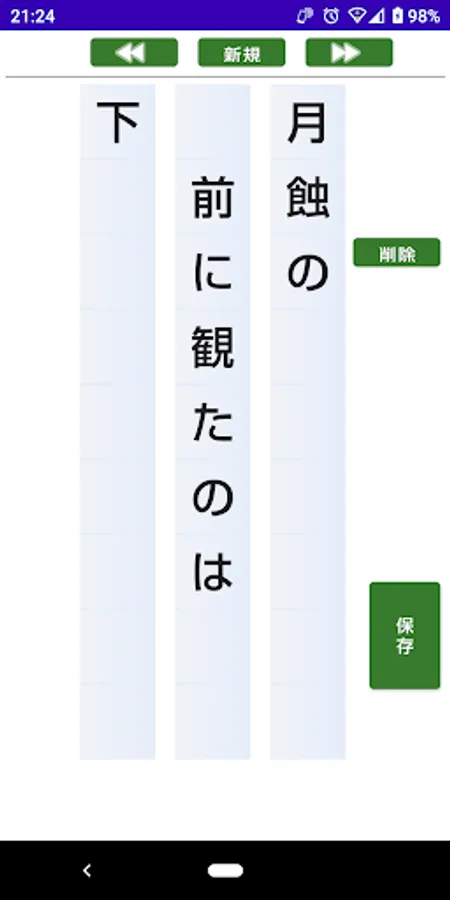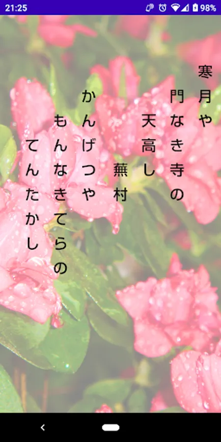 Hide one of the top, middle, and bottom phrases of a famous haiku, and select and input from reference characters. Haiku are by Basho, Buson, Shiki, etc., and there are currently about 150 haiku.