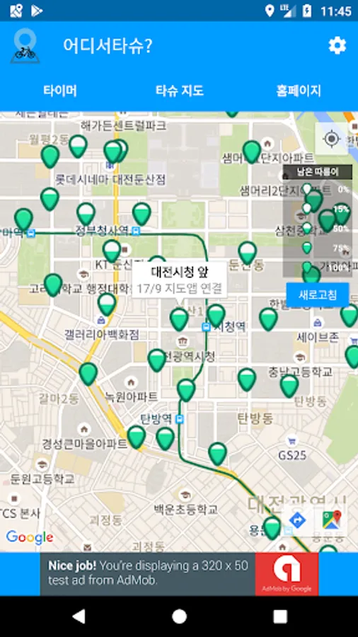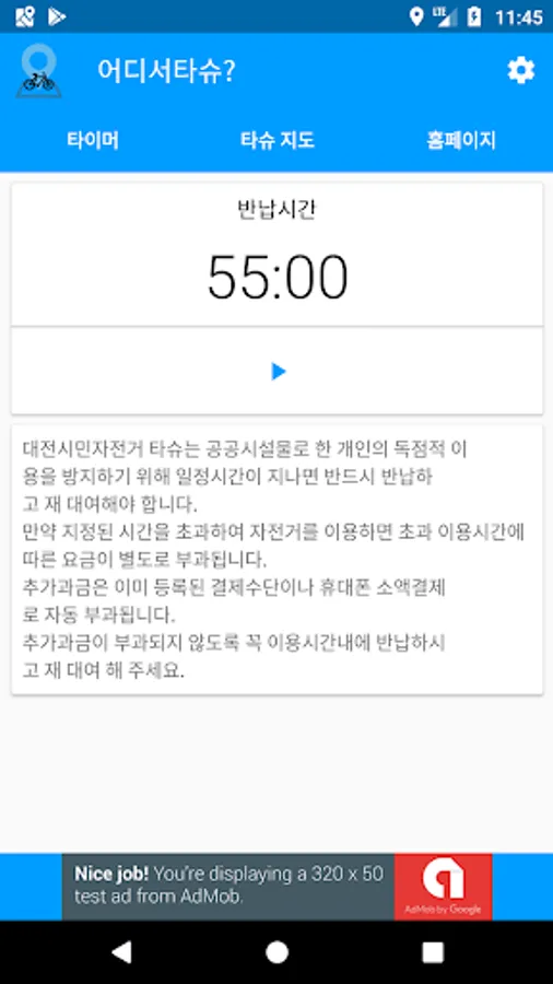 It provides a map which can be found 55 minutes to return the timer and stop locations and quantities of Daejeon shared bicycle tasyu.