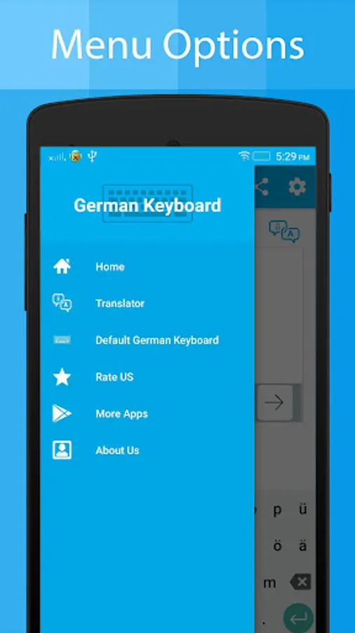 ► German Language Keyboard : You can share the translated German text to your friends and family using messages, emails, blogs.