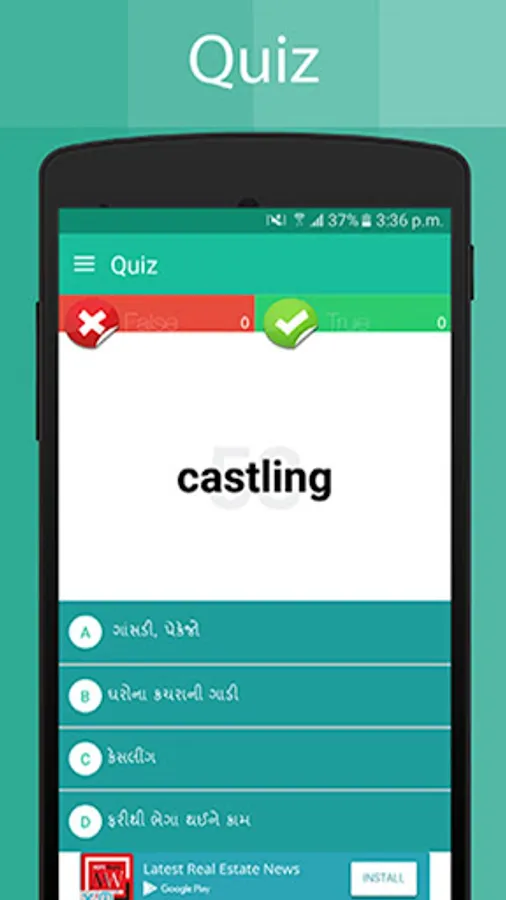 ✓ Learning a new language can not be done with a simple dictionary! We should put you in real cases to see if you will be able to speak with it or not. And that’s why, we developed a new quiz inside Gujarati dictionary! To take the quiz, you can easily tap the option icon in the top left side of the screen and choose quiz. Now, you will see a word in the screen with 4 answers, you will have to tap the answer that you think its right to see if it’s the good choice or not. Keep in mind, that there’s a countdown timer and if it finishes without a reply from you, then the quiz will ends.