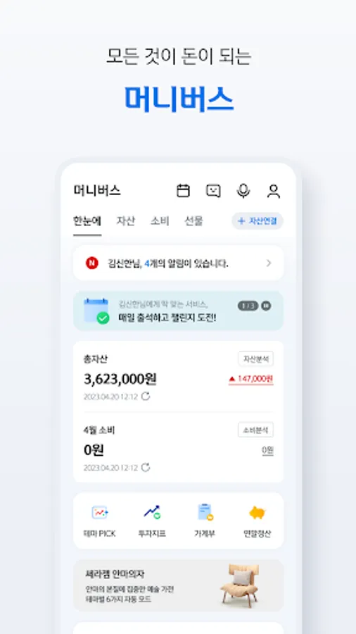 From financial assets such as banks, cards, stocks, and various pays to real assets such as real estate, automobiles, and mobile phones, my asset management is all at once, and fixed spending schedules, household account book budget management, and tax saving methods are all in one place to secure money and make money.