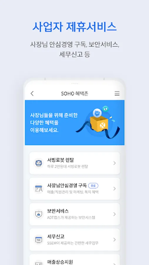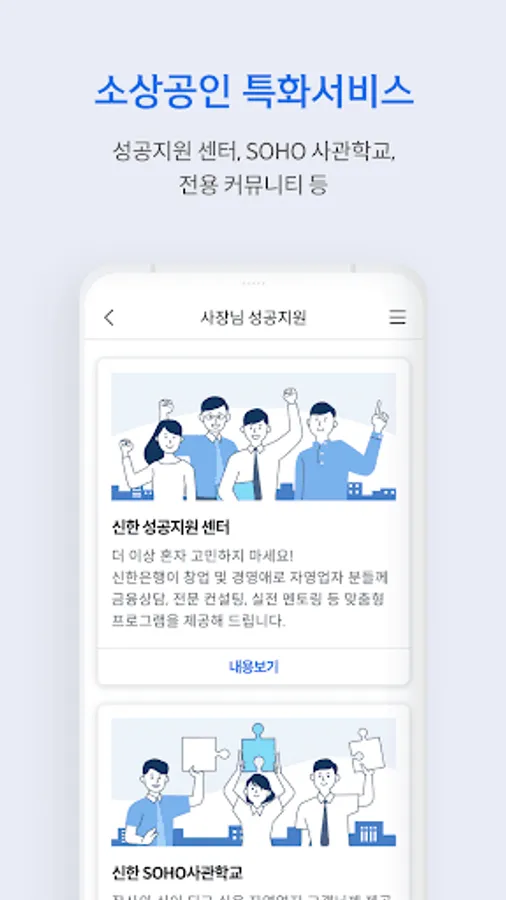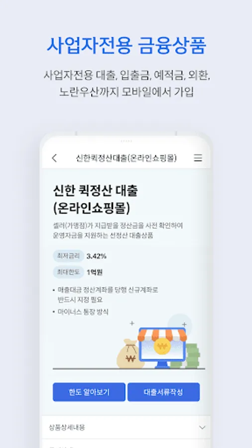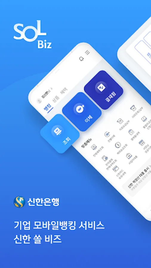 In addition to basic banking services such as inquiries and transfers, it provides multi-step payment functions essential for business operations, non-face-to-face membership sign-up, integrated fund management to search financial information of other banks, and product mall to sign up for products non-face-to-face. , Shinhan Bank's representative mobile corporate banking that enhances the convenience of corporate customers through the expansion of mobile services, such as non-financial service support for management support for SOHO customers. (For personal use, use the Shinhan Sol (SOL) app)