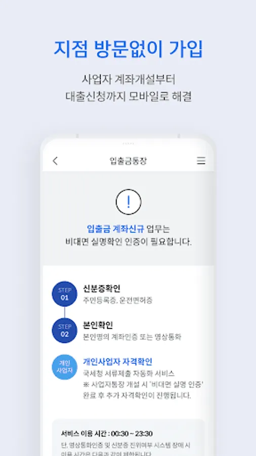 - Non-face-to-face service application (individual business): After installing SOL Biz, you can sign up and open an account by proceeding with the process of self-authentication and non-face-to-face real-name verification