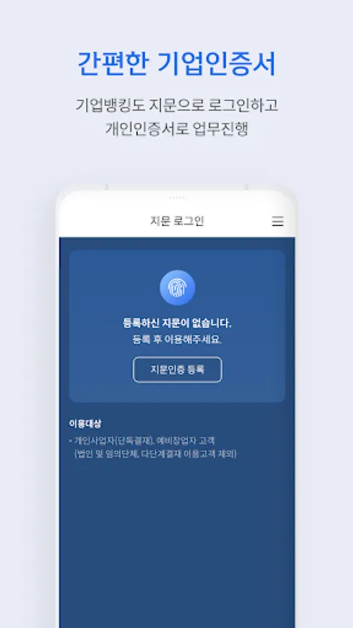 - Simple login: SOHO customers can log in with a simple method such as PIN number, pattern, fingerprint, etc. without a corporate certificate