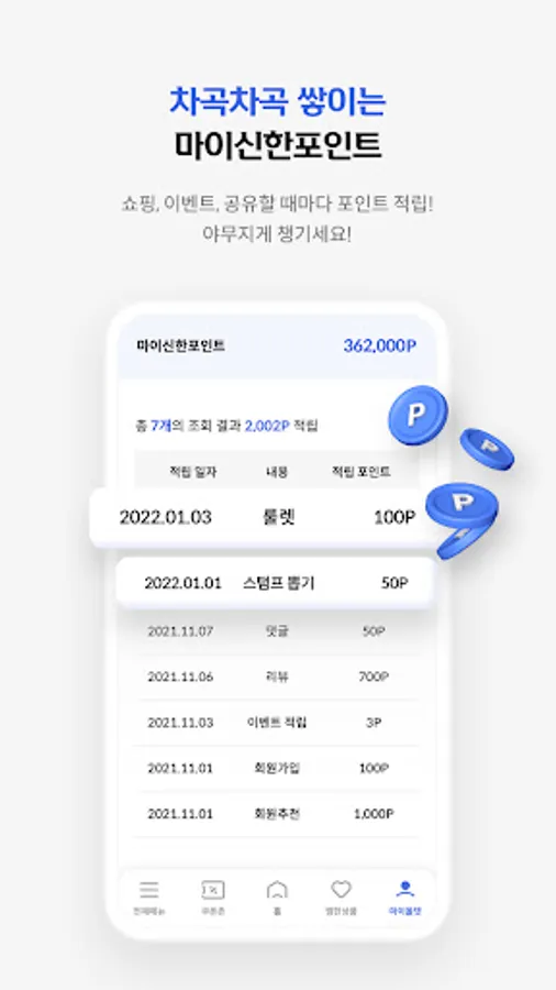 - Membership signup, member recommendation, product recommendation, review writing, point sharing and roulette, attendance check,