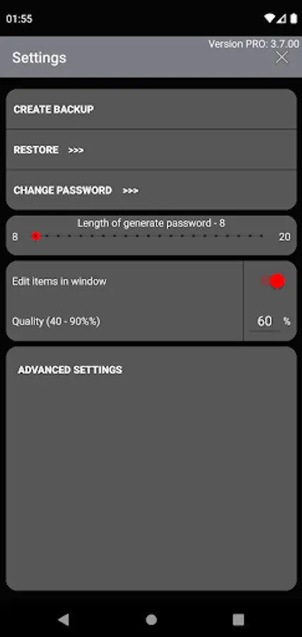 Install the full version of CryptoBook, which does not contain ads, allows you to restore data from a backup, create an unlimited number of passwords, documents and notes, and download documents from third-party applications.