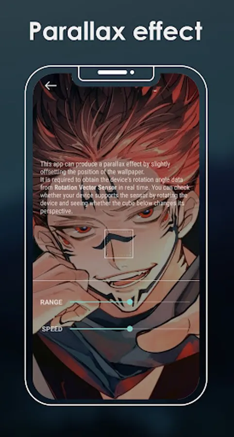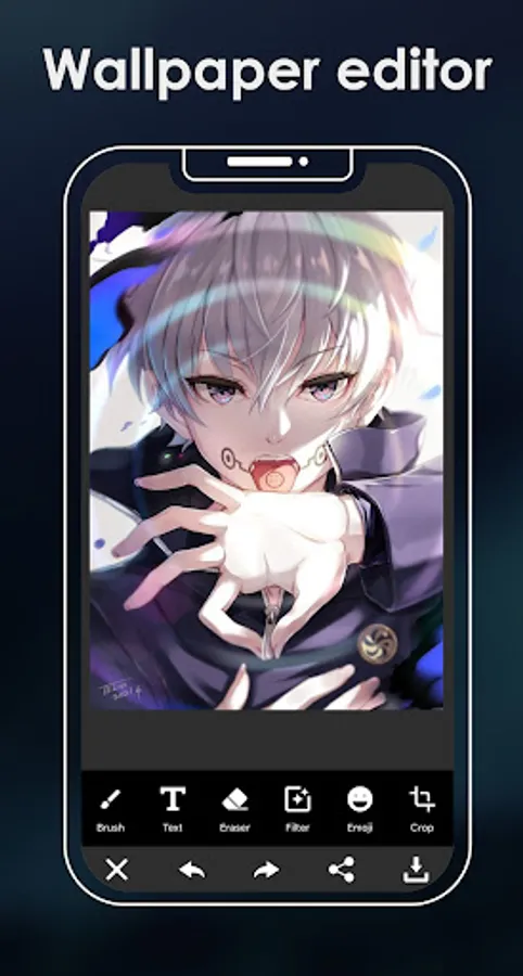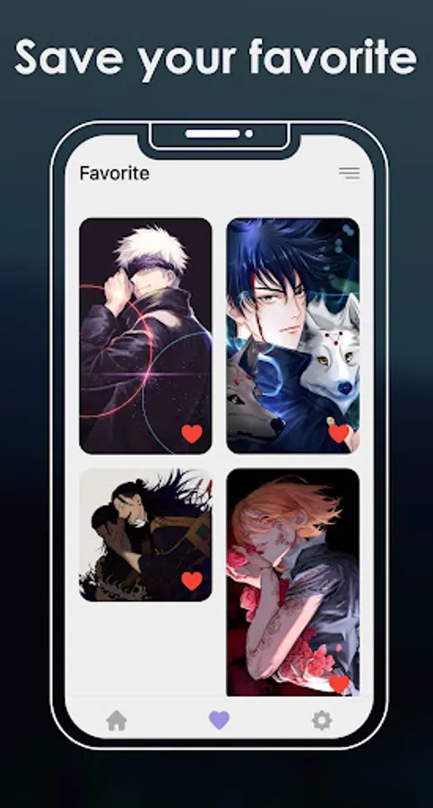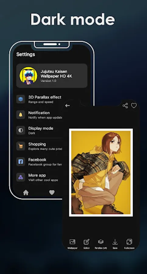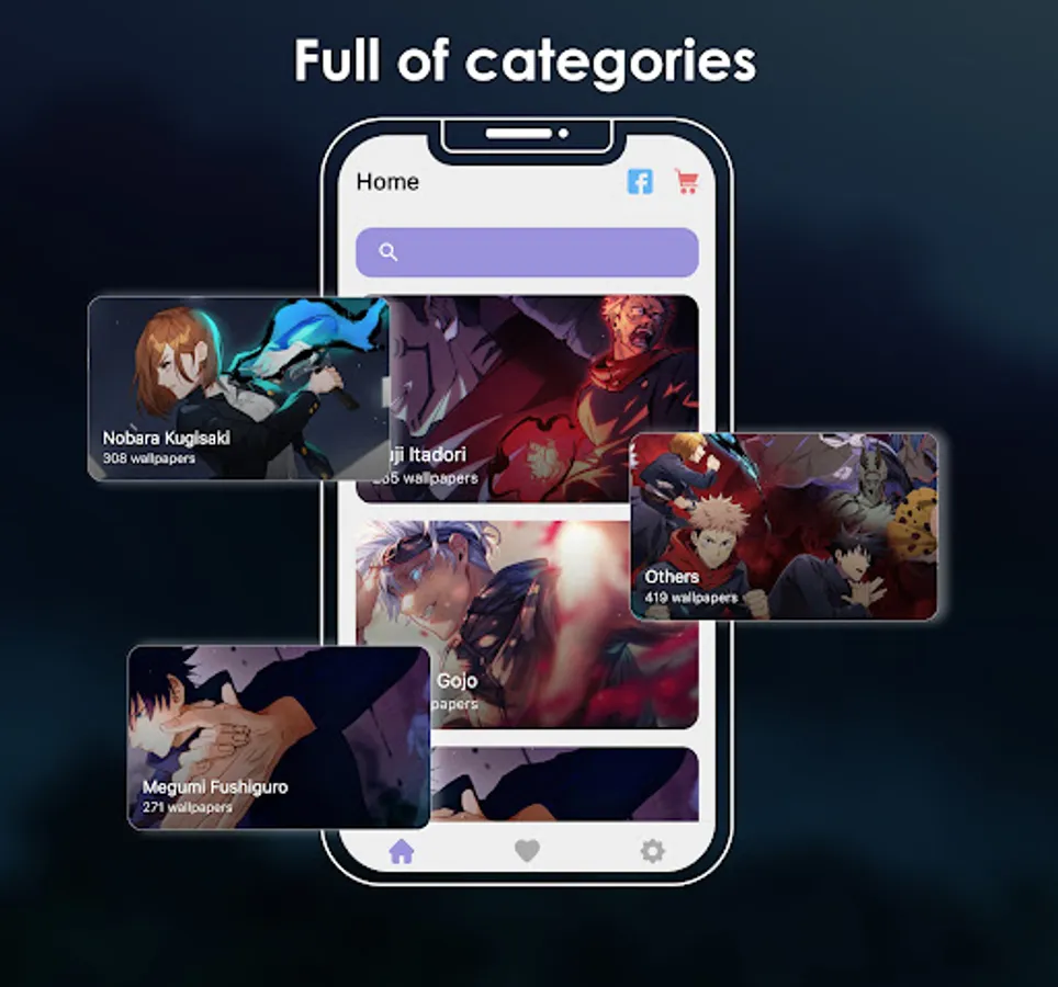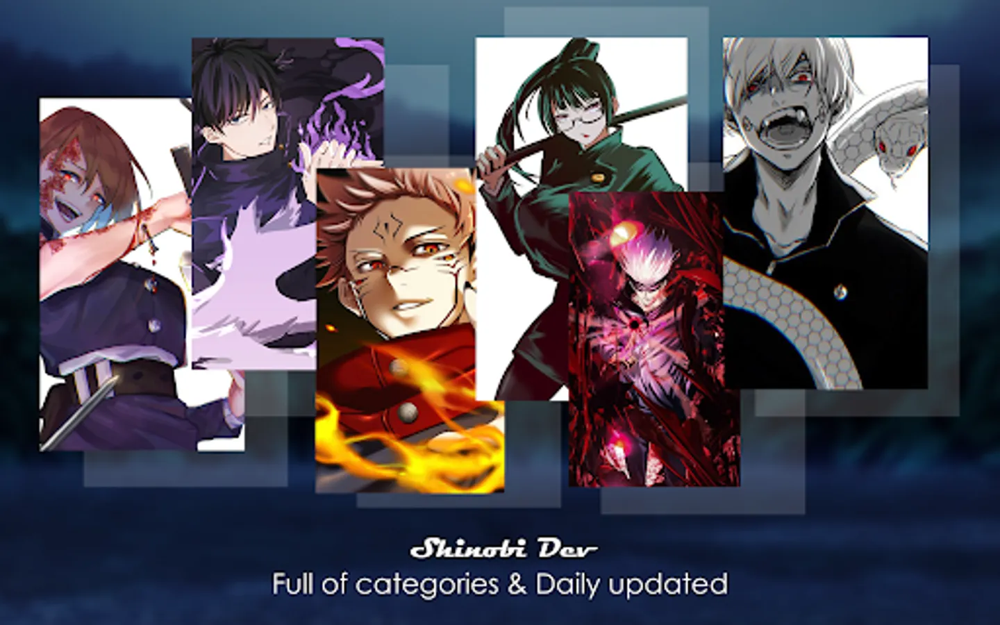 This app provides a huge collection of wallpapers: Yuji Itadori, Megumi Fushiguro, Satoru Gojo, Nobara Kugisaki , Maki Zen'in, Toge Inumaki , Panda, Yuta Okkotsu, Kento Nanami, Kiyotaka Ijichi, Shoko Ieiri, Masamichi Yaga, Aoi Todo, Mai Zen'in, Kasumi Miwa, Kokichi Muta, Momo Nishimiya, Noritoshi Kamo, Mei Mei, Tengen, Hana Kurusu, Mahito, Ryomen Sukuna, Jogo, Hanami, Dagon, etc.